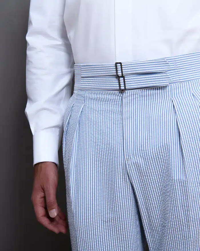 La pince est un pli du tissu situé sur l’avant du pantalon. Elle a une fonction à la fois technique et esthétique : elle apporte de l’aisance au niveau des hanches tout en préservant une taille fine. Cette construction permet d’obtenir une silhouette harmonieuse, sans tension au niveau du bassin. Il ne faut pas la confondre avec le pli marqué au fer le long de la jambe, qui ne joue qu’un rôle visuel. Dans un pantalon sur mesure, la pince est ajustée au millimètre pour accompagner le mouvement et garantir un tombé impeccable.