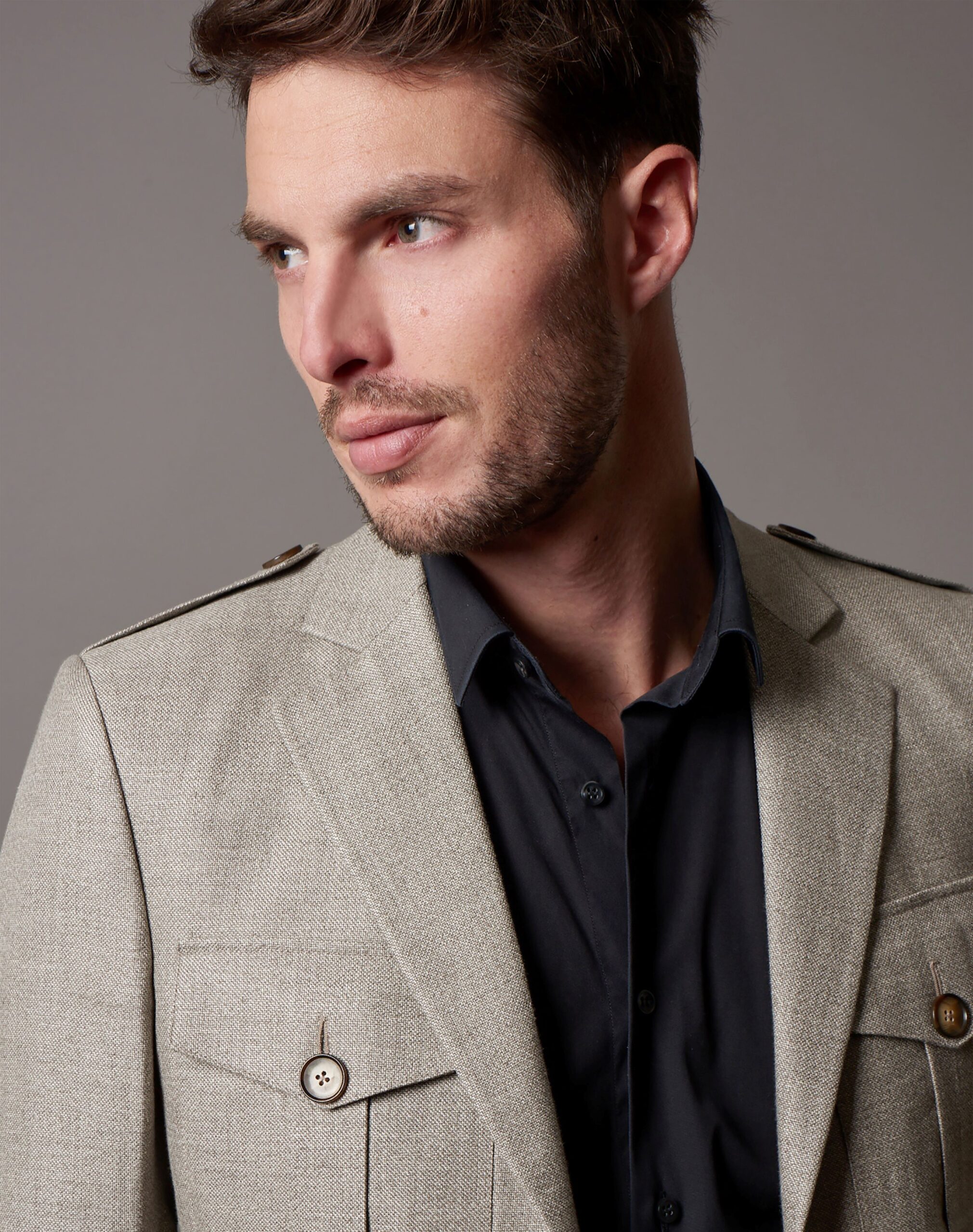 Notre Saharienne sur-mesure avec sa ligne cintrée et ses poches plaquées subtilement travaillées pourra être portée aussi bien en voyage que de manière plus élégante en ville. Disponible en coton, laine froide, chanvre, lin ou fresco.